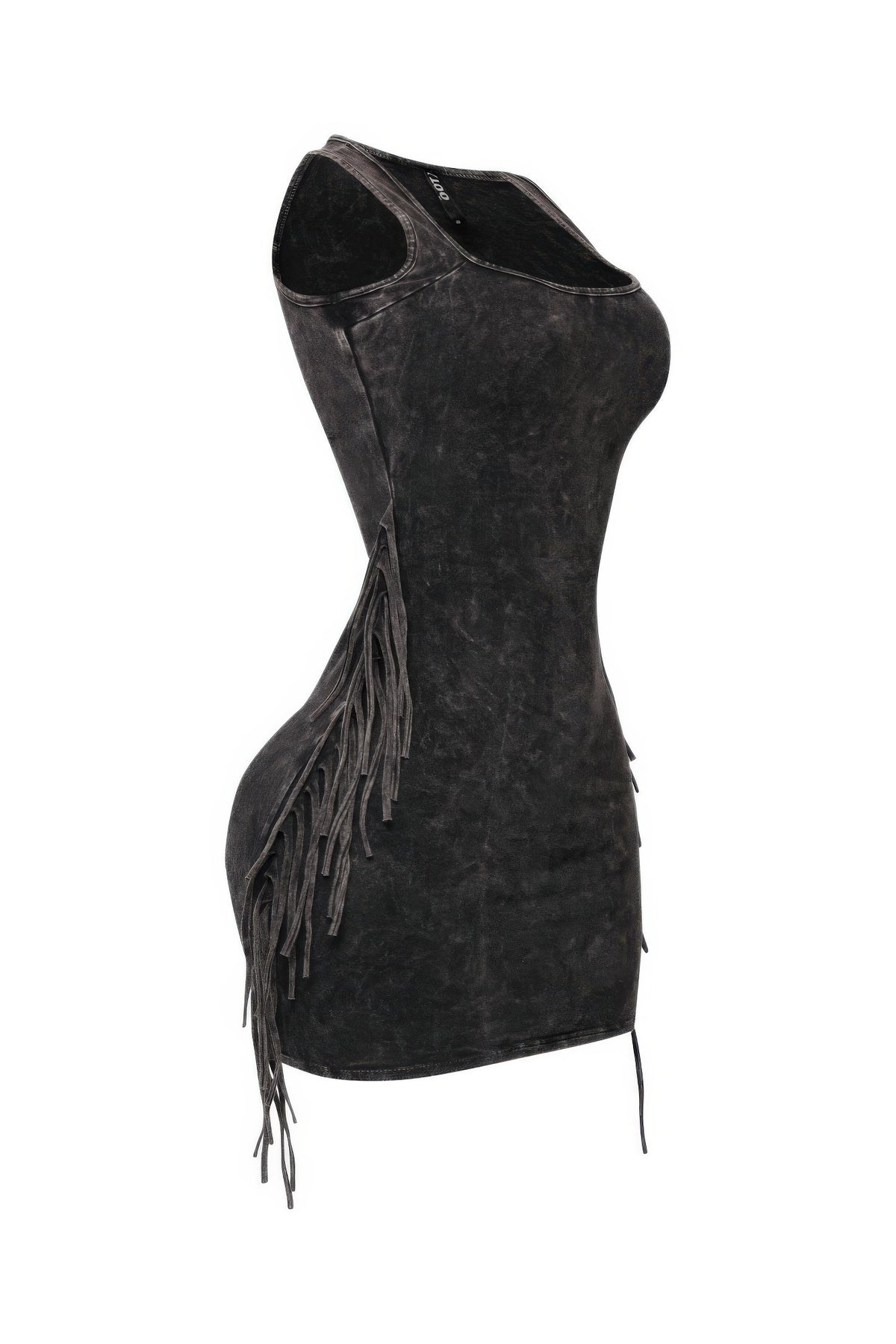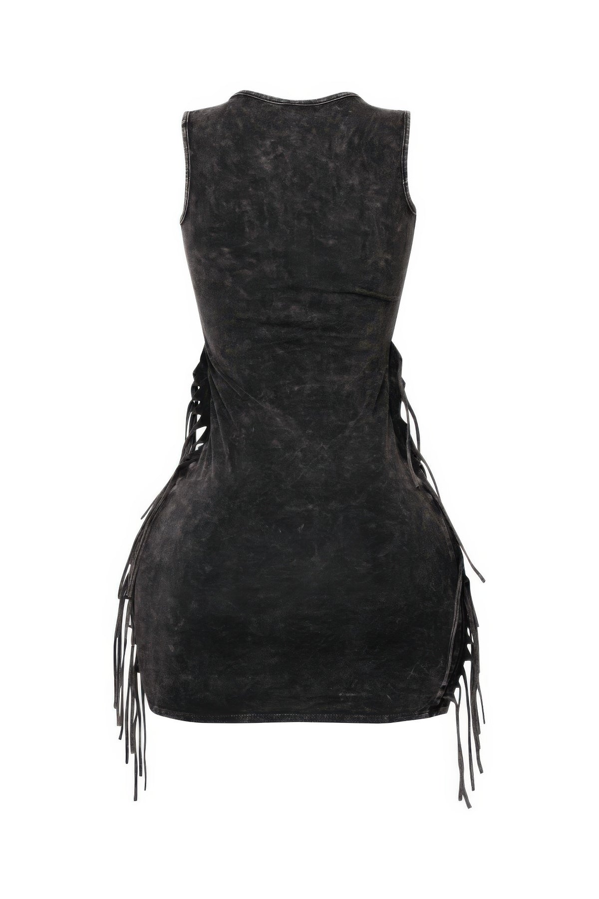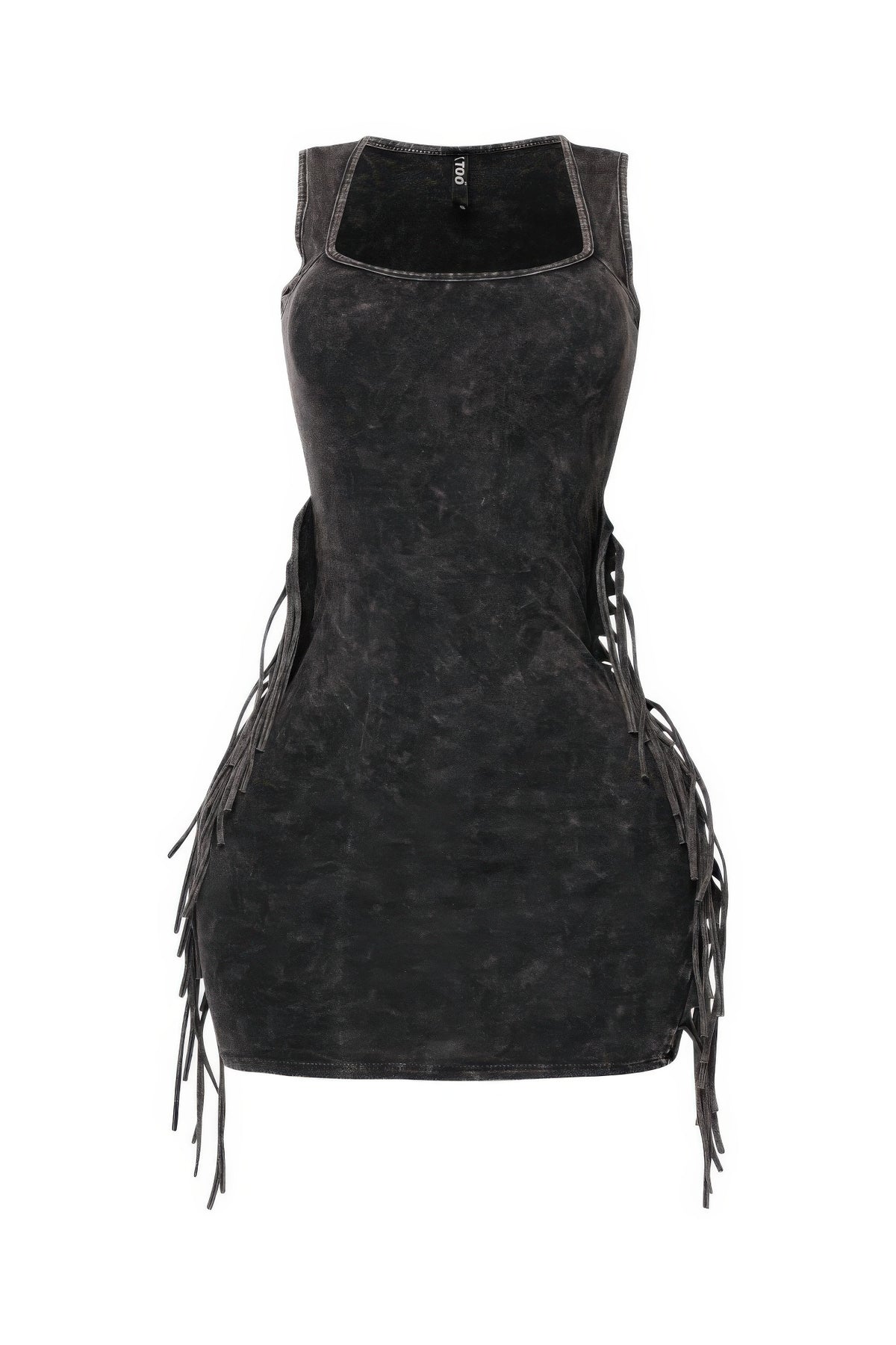 Add effortless edge to your look with this mineral washed side fringe mini dress, designed to flatter with a close, comfortable fit. The squared neckline and sleeveless cut create a clean, structured silhouette, while the mineral wash gives it a cool, worn-in finish. Fringe detailing along the sides adds bold movement and a touch of personality. Made from a soft, stretchy cotton blend, this pull-on dress hugs the body without feeling too tight. Unlined and not sheer, it’s perfect for festivals, casual nights, or standout everyday style.
