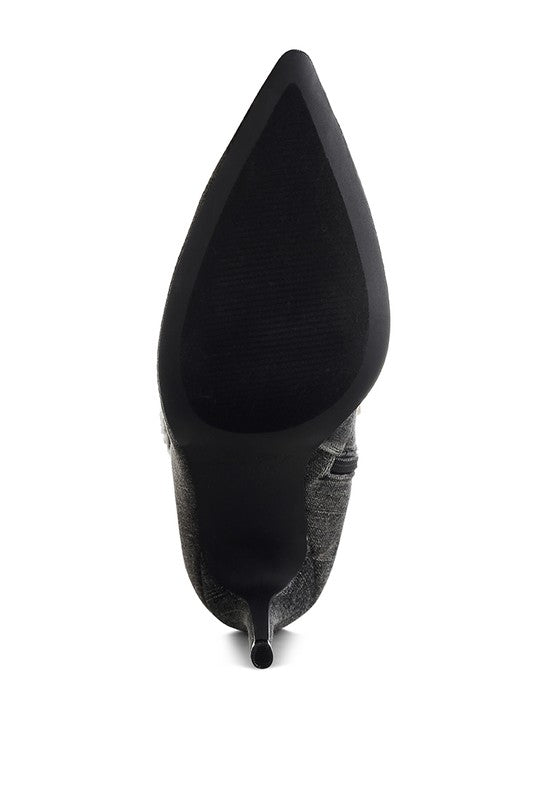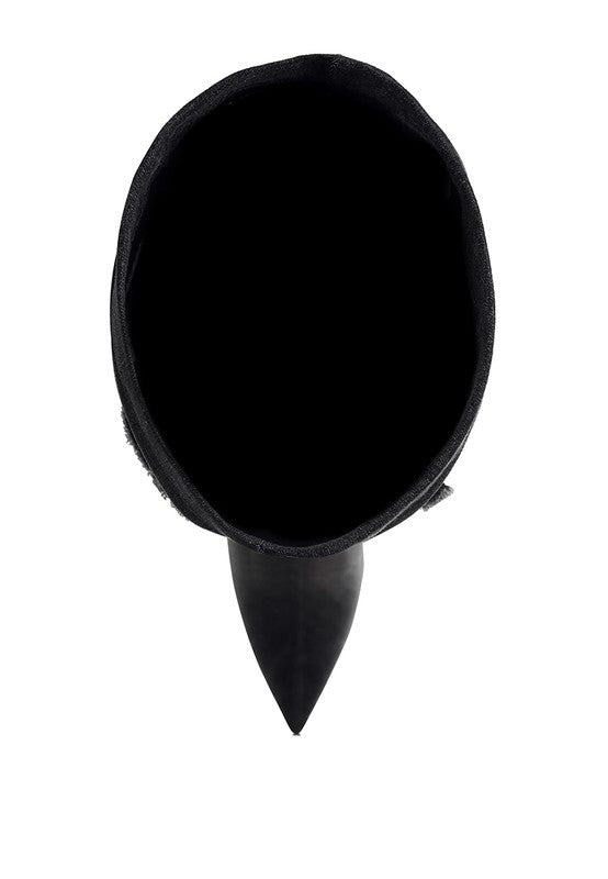 The knee high boots are edgy in all their glory with the distressed and paneling detail. The rhinestone embellishments take the visual appeal to the next level with the subtle bling. The stiletto boots have soft insoles which cut strain and ensure a relaxed fit.